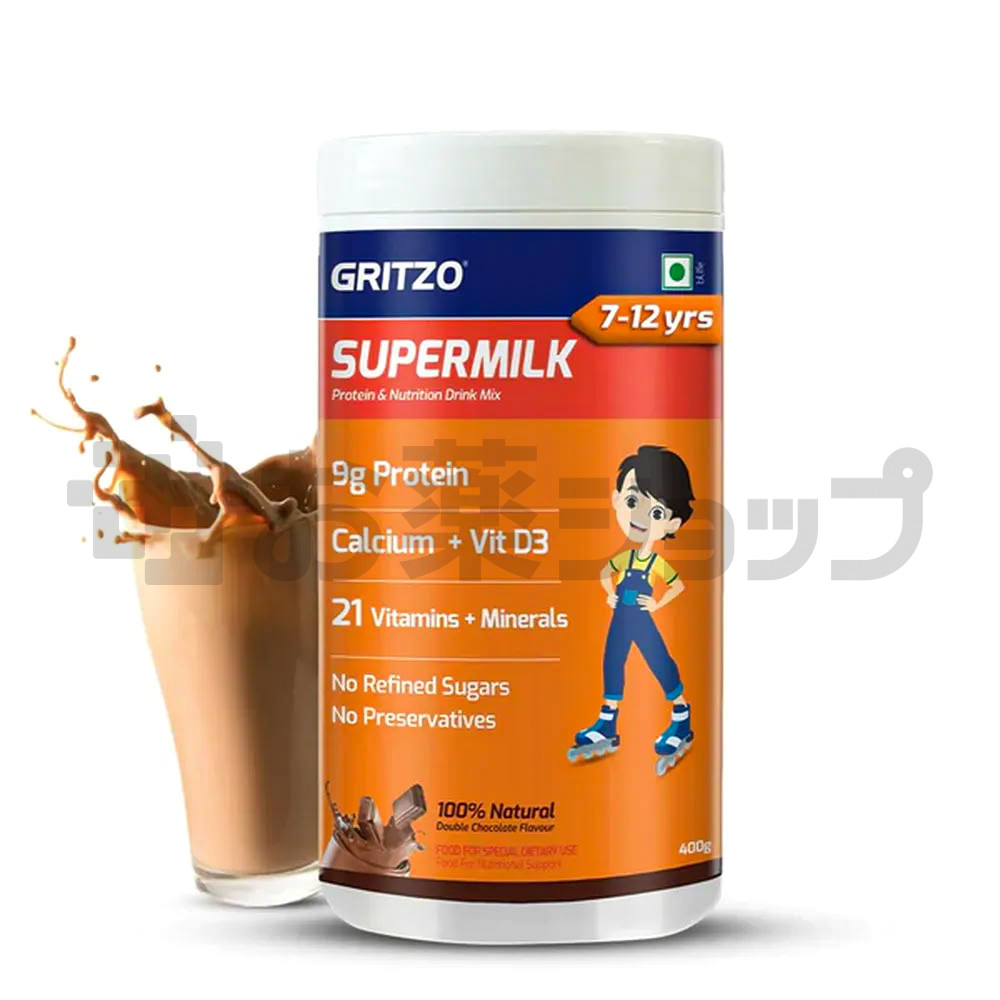GRITZO SUPERMILK FOR ACTIVE KIDS, PROTEIN POWDER FOR KIDS, HIGH PROTEIN (6 G), DHA, CALCIUM + D3, 21 NUTRIENTS, NO REFINED SUGAR, 100% NATURAL DOUBLE CHOCOLATE FLAVOUR 7-12 YRS 400G